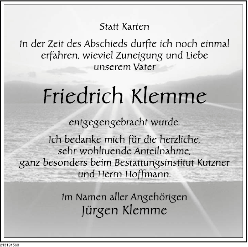 Hier finden Sie alle Traueranzeigen aus der Zeitung, die bisher für klemme Danksagung erschienen sind. Weitere Traueranzeigen, die in der Zeitung erscheinen, werden hier ebenfalls aufgelistet
