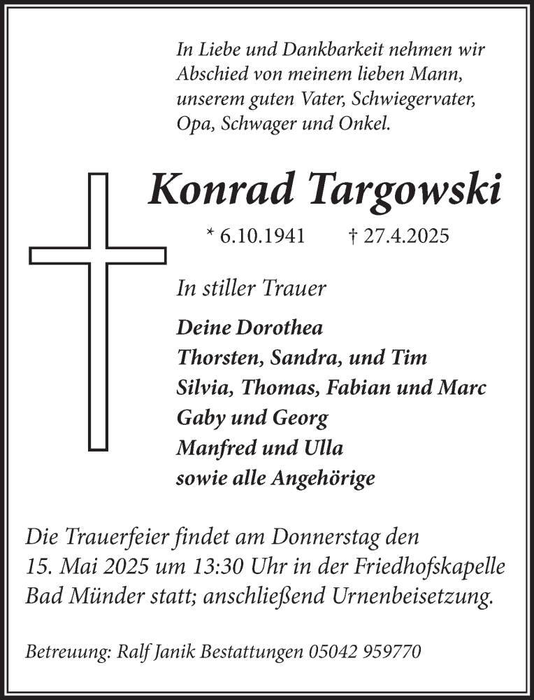 Hier finden Sie alle Traueranzeigen aus der Zeitung, die bisher für Konrad Targowski erschienen sind. Weitere Traueranzeigen, die in der Zeitung erscheinen, werden hier ebenfalls aufgelistet