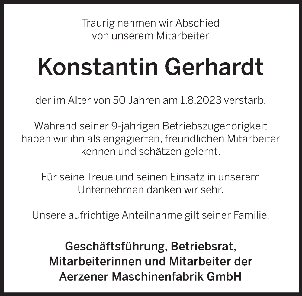 Hier finden Sie alle Traueranzeigen aus der Zeitung, die bisher für Konstantin Gerhardt erschienen sind. Weitere Traueranzeigen, die in der Zeitung erscheinen, werden hier ebenfalls aufgelistet