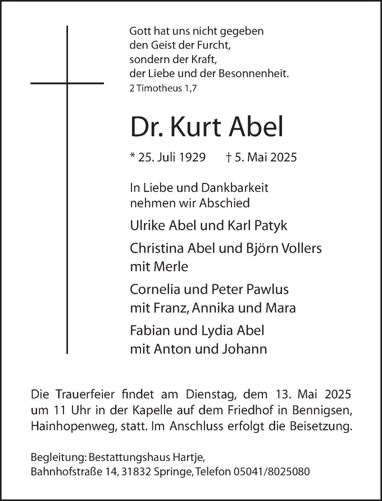 Hier finden Sie alle Traueranzeigen aus der Zeitung, die bisher für Kurt Abel erschienen sind. Weitere Traueranzeigen, die in der Zeitung erscheinen, werden hier ebenfalls aufgelistet