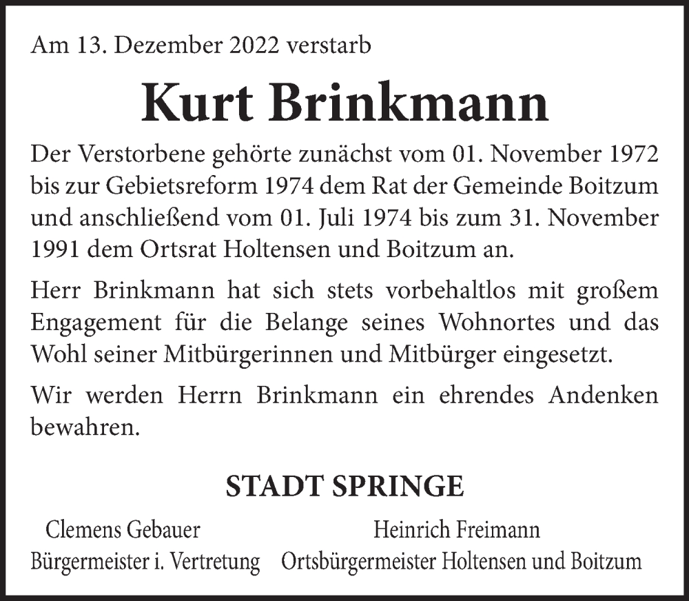 Hier finden Sie alle Traueranzeigen aus der Zeitung, die bisher für Kurt Brinkmann erschienen sind. Weitere Traueranzeigen, die in der Zeitung erscheinen, werden hier ebenfalls aufgelistet