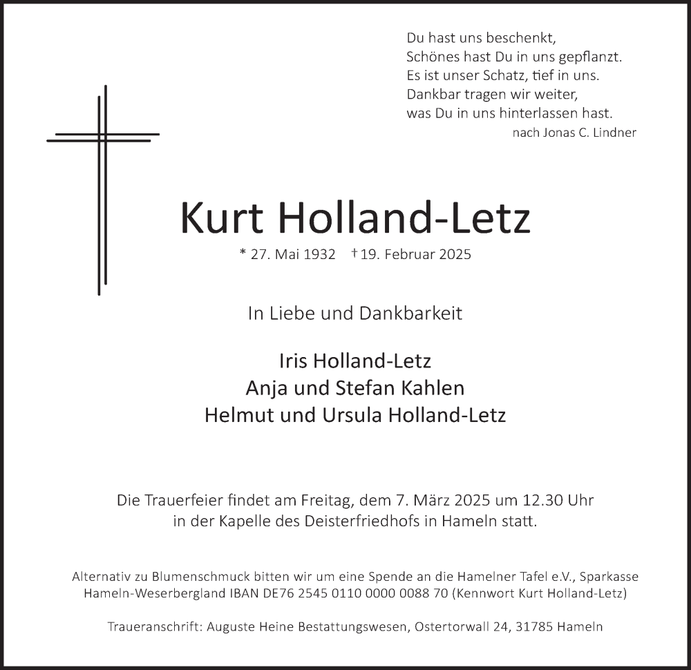 Hier finden Sie alle Traueranzeigen aus der Zeitung, die bisher für Kurt Holland-Letz erschienen sind. Weitere Traueranzeigen, die in der Zeitung erscheinen, werden hier ebenfalls aufgelistet
