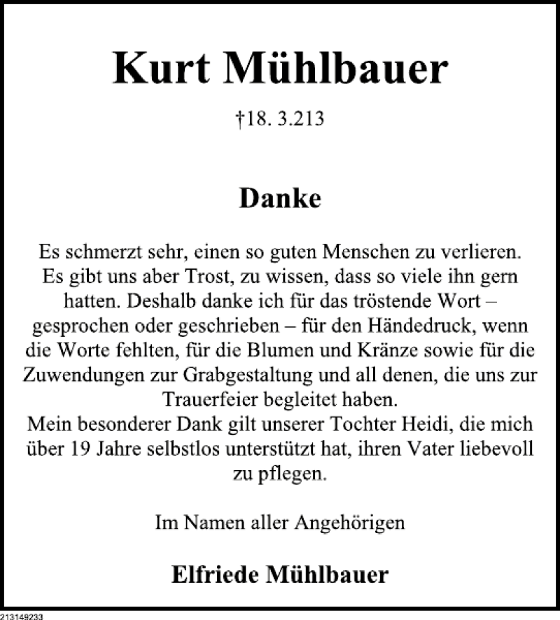 Hier finden Sie alle Traueranzeigen aus der Zeitung, die bisher für Kurt Mühlbauer erschienen sind. Weitere Traueranzeigen, die in der Zeitung erscheinen, werden hier ebenfalls aufgelistet