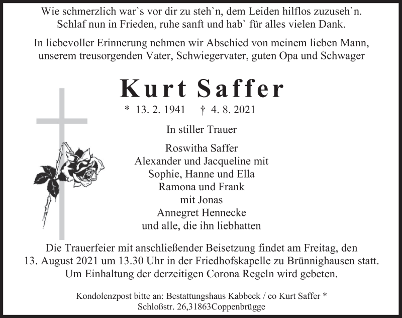 Hier finden Sie alle Traueranzeigen aus der Zeitung, die bisher für Kurt Saffer erschienen sind. Weitere Traueranzeigen, die in der Zeitung erscheinen, werden hier ebenfalls aufgelistet