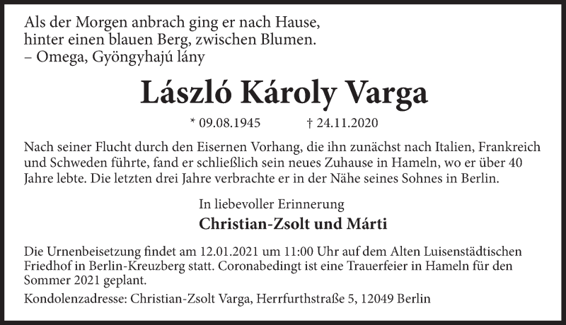 Hier finden Sie alle Traueranzeigen aus der Zeitung, die bisher für Laszlo Karoly Varga erschienen sind. Weitere Traueranzeigen, die in der Zeitung erscheinen, werden hier ebenfalls aufgelistet