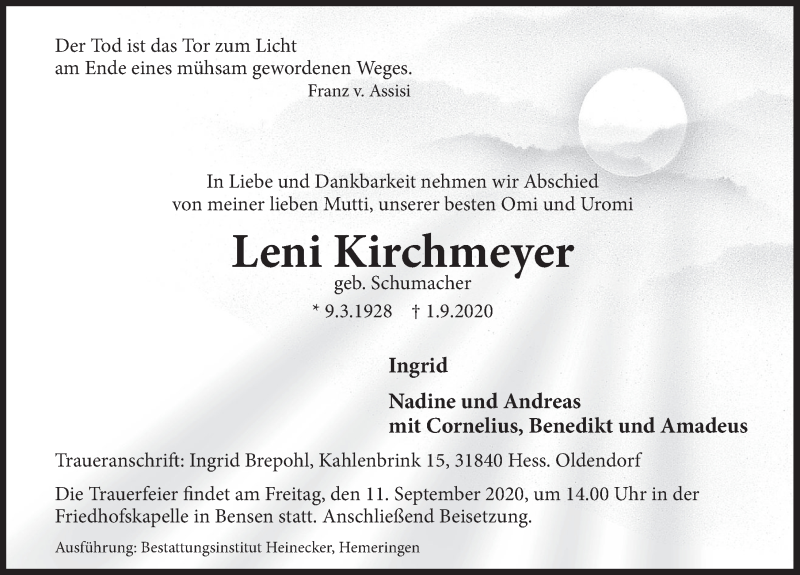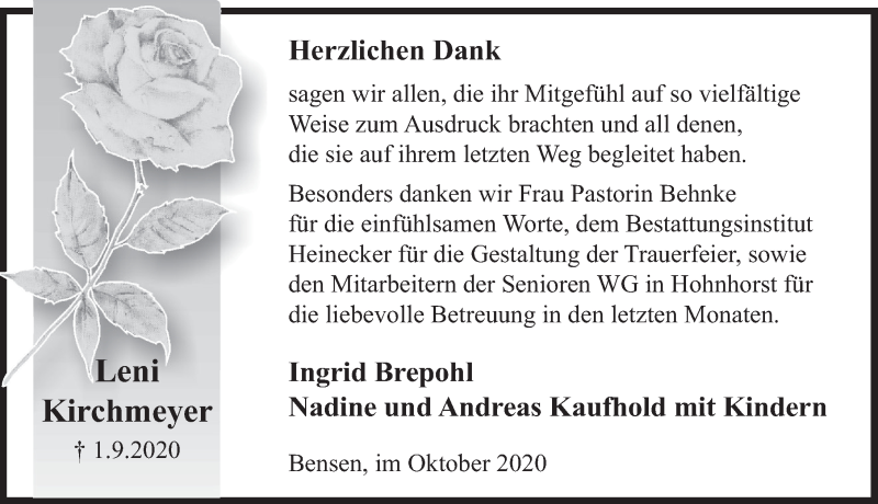 Hier finden Sie alle Traueranzeigen aus der Zeitung, die bisher für Leni Kirchmeyer erschienen sind. Weitere Traueranzeigen, die in der Zeitung erscheinen, werden hier ebenfalls aufgelistet