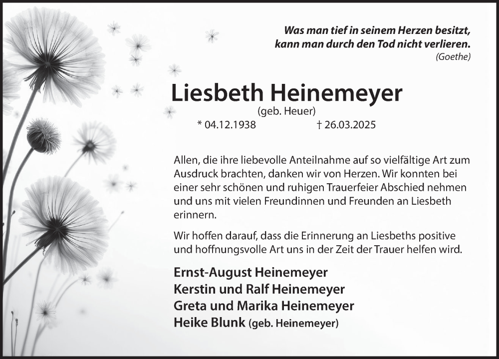 Hier finden Sie alle Traueranzeigen aus der Zeitung, die bisher für Liesbeth Heinemeyer erschienen sind. Weitere Traueranzeigen, die in der Zeitung erscheinen, werden hier ebenfalls aufgelistet