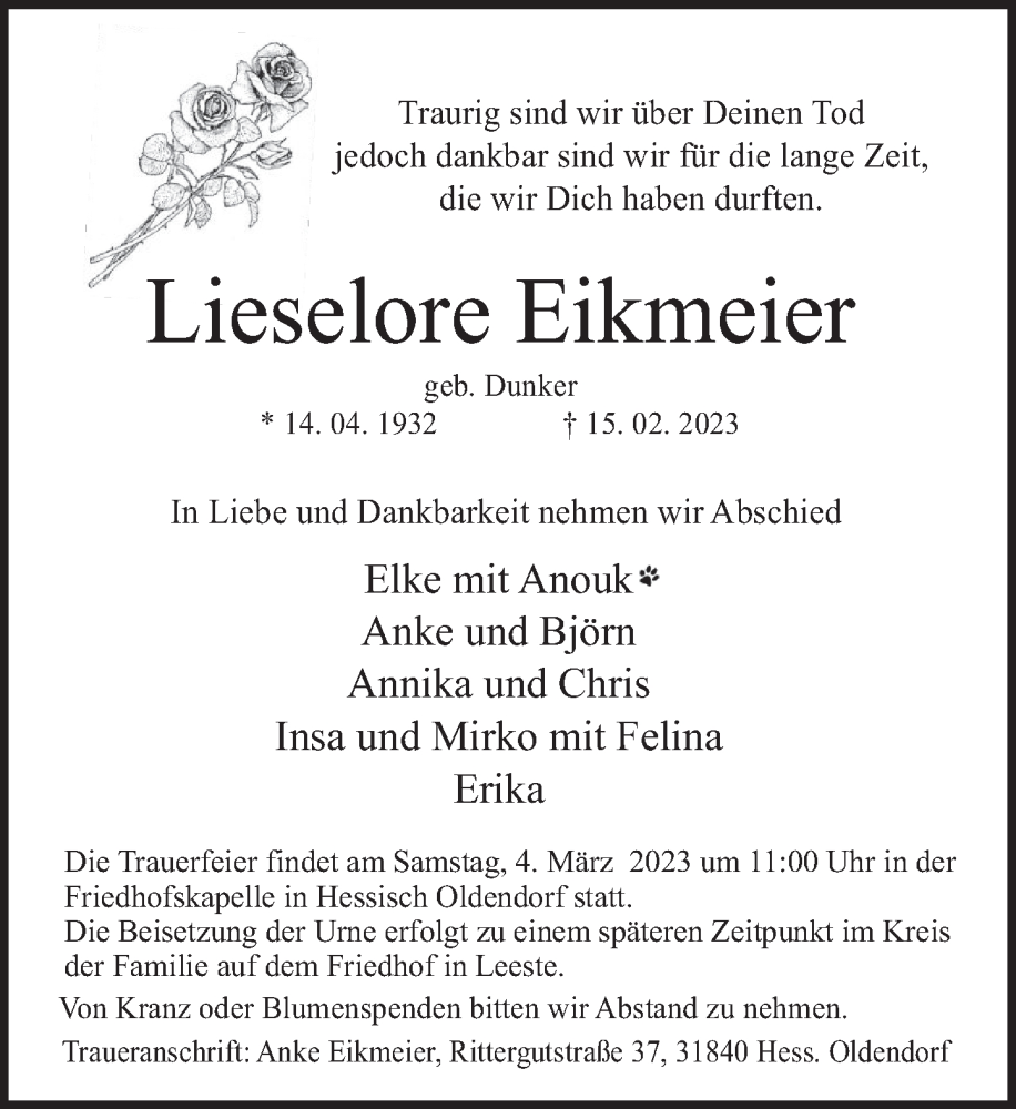 Hier finden Sie alle Traueranzeigen aus der Zeitung, die bisher für Lieselore Eikmeier erschienen sind. Weitere Traueranzeigen, die in der Zeitung erscheinen, werden hier ebenfalls aufgelistet