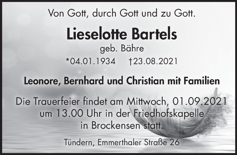 Hier finden Sie alle Traueranzeigen aus der Zeitung, die bisher für Lieselotte Bartels erschienen sind. Weitere Traueranzeigen, die in der Zeitung erscheinen, werden hier ebenfalls aufgelistet