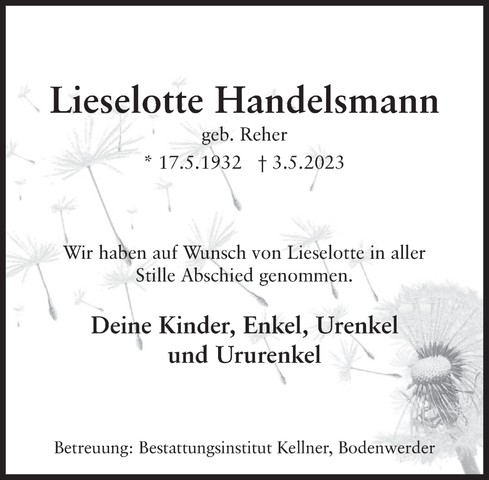 Hier finden Sie alle Traueranzeigen aus der Zeitung, die bisher für Lieselotte Handelsmann erschienen sind. Weitere Traueranzeigen, die in der Zeitung erscheinen, werden hier ebenfalls aufgelistet