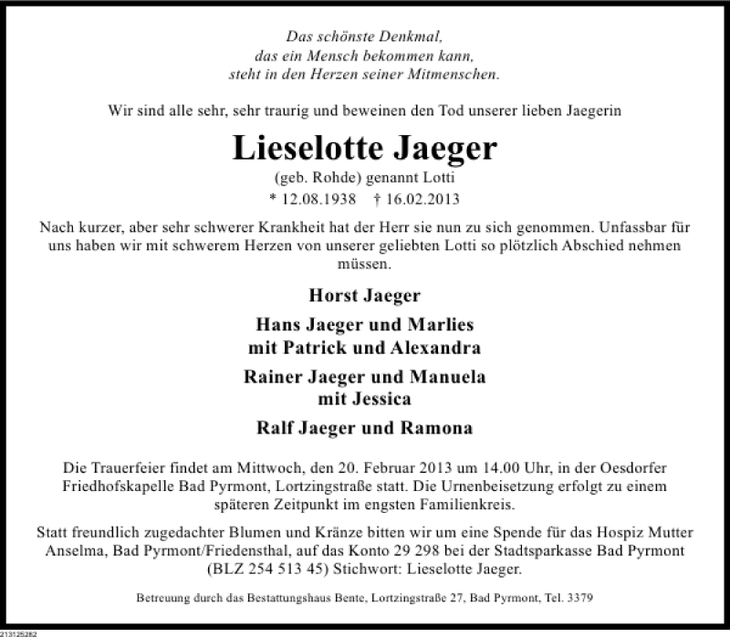 Hier finden Sie alle Traueranzeigen aus der Zeitung, die bisher für Lieselotte Jaeger erschienen sind. Weitere Traueranzeigen, die in der Zeitung erscheinen, werden hier ebenfalls aufgelistet