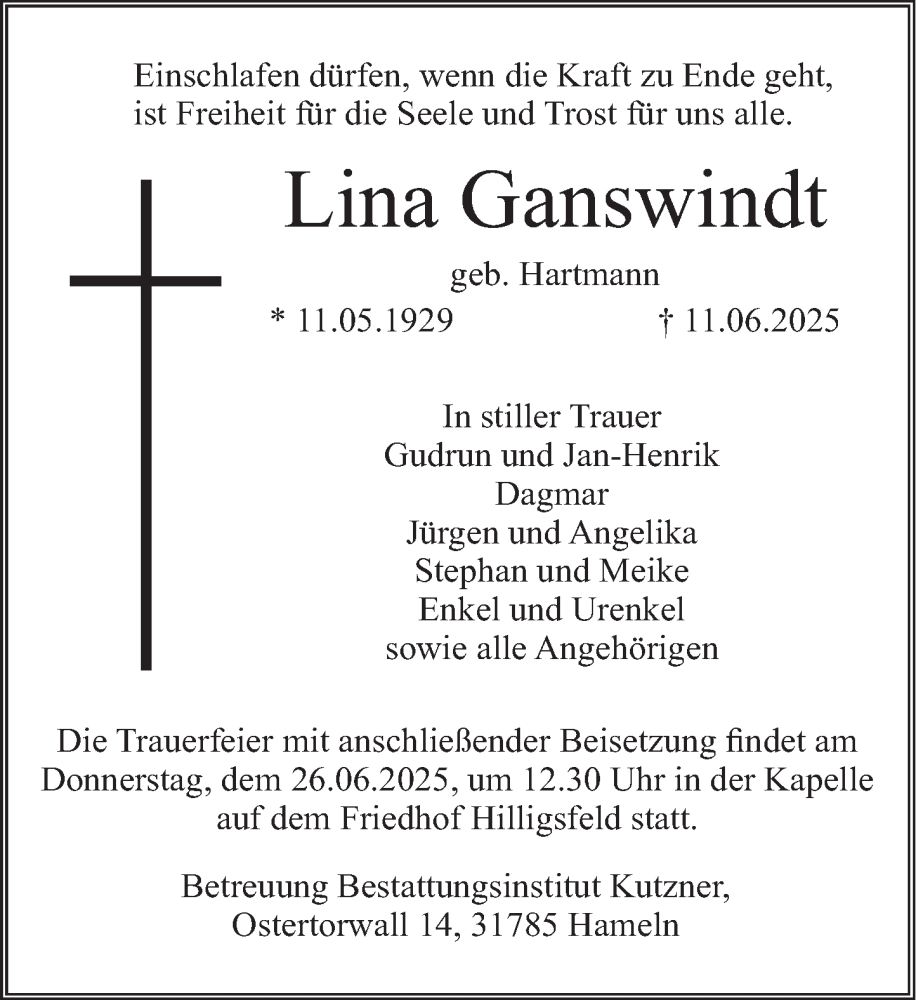 Hier finden Sie alle Traueranzeigen aus der Zeitung, die bisher für Lina Ganswindt erschienen sind. Weitere Traueranzeigen, die in der Zeitung erscheinen, werden hier ebenfalls aufgelistet