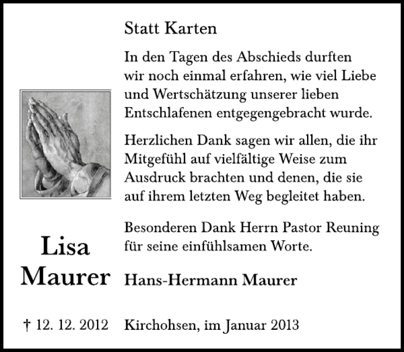 Hier finden Sie alle Traueranzeigen aus der Zeitung, die bisher für Lisa Maurer erschienen sind. Weitere Traueranzeigen, die in der Zeitung erscheinen, werden hier ebenfalls aufgelistet