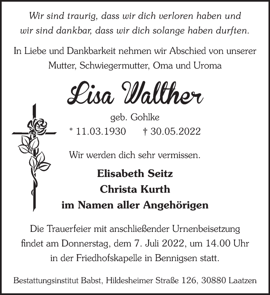 Hier finden Sie alle Traueranzeigen aus der Zeitung, die bisher für Lisa Walther erschienen sind. Weitere Traueranzeigen, die in der Zeitung erscheinen, werden hier ebenfalls aufgelistet
