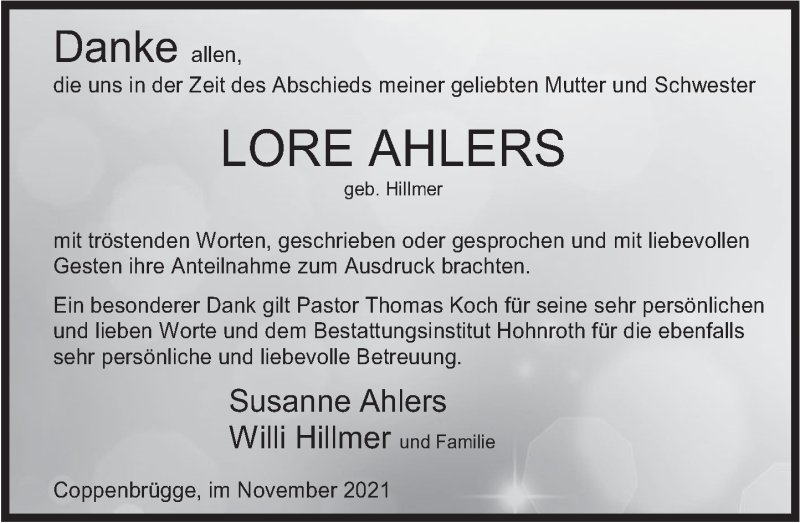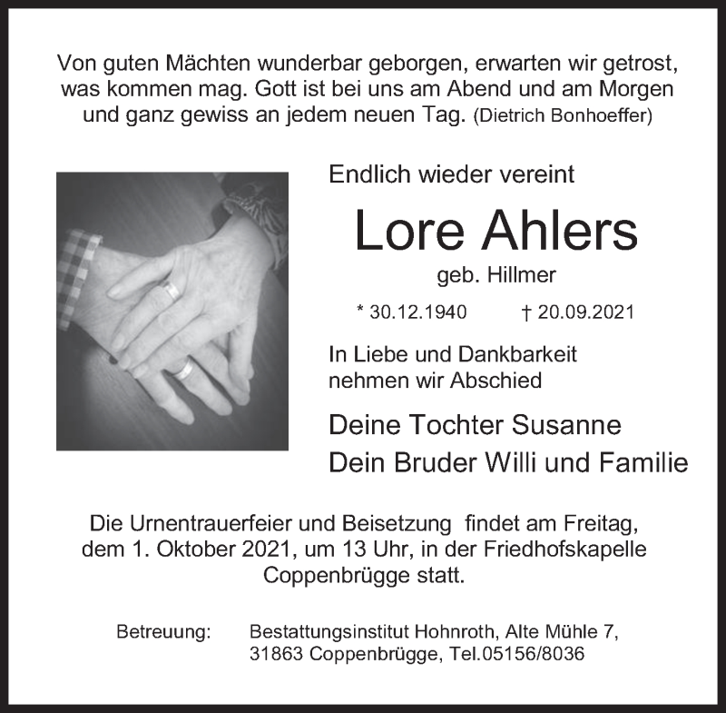 Hier finden Sie alle Traueranzeigen aus der Zeitung, die bisher für Lore Ahlers erschienen sind. Weitere Traueranzeigen, die in der Zeitung erscheinen, werden hier ebenfalls aufgelistet