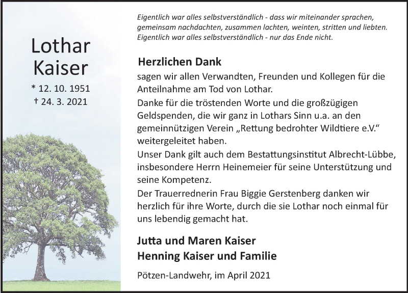 Hier finden Sie alle Traueranzeigen aus der Zeitung, die bisher für Lothar Kaiser erschienen sind. Weitere Traueranzeigen, die in der Zeitung erscheinen, werden hier ebenfalls aufgelistet