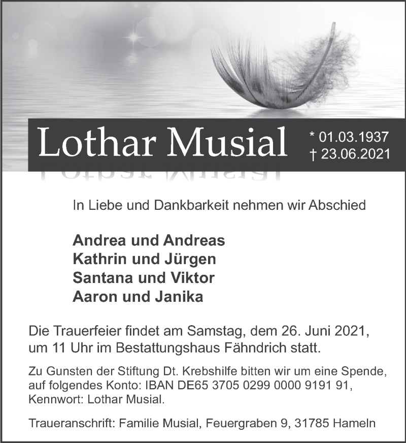 Hier finden Sie alle Traueranzeigen aus der Zeitung, die bisher für Lothar Musial erschienen sind. Weitere Traueranzeigen, die in der Zeitung erscheinen, werden hier ebenfalls aufgelistet