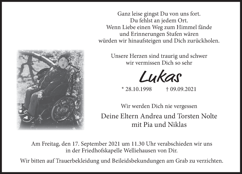 Hier finden Sie alle Traueranzeigen aus der Zeitung, die bisher für Lukas erschienen sind. Weitere Traueranzeigen, die in der Zeitung erscheinen, werden hier ebenfalls aufgelistet