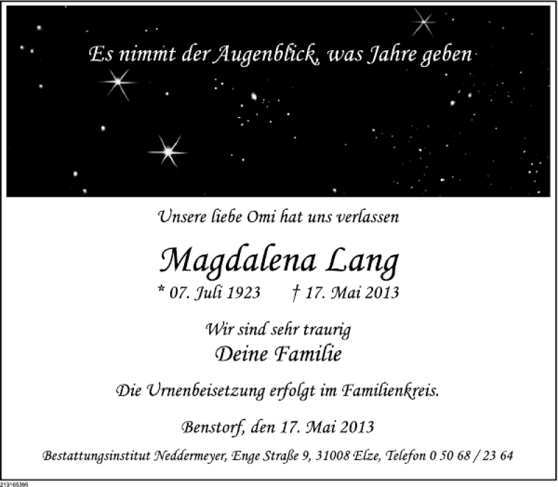 Hier finden Sie alle Traueranzeigen aus der Zeitung, die bisher für Magdalena Lang erschienen sind. Weitere Traueranzeigen, die in der Zeitung erscheinen, werden hier ebenfalls aufgelistet