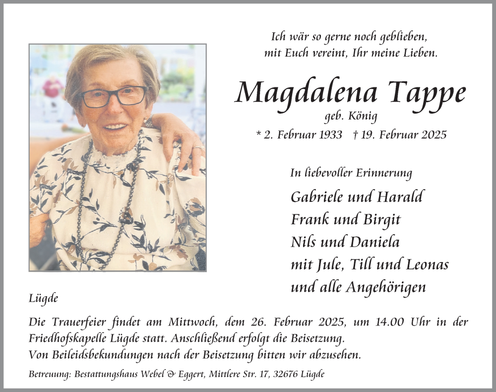 Hier finden Sie alle Traueranzeigen aus der Zeitung, die bisher für Magdalena Tappe erschienen sind. Weitere Traueranzeigen, die in der Zeitung erscheinen, werden hier ebenfalls aufgelistet