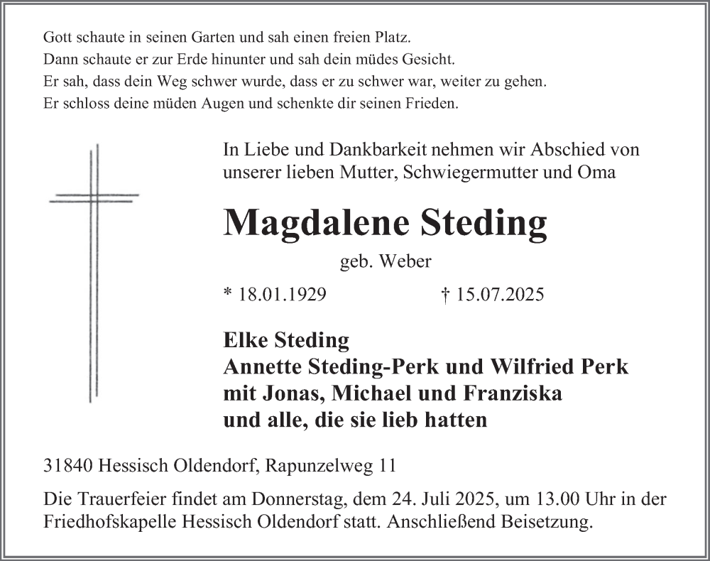 Hier finden Sie alle Traueranzeigen aus der Zeitung, die bisher für Magdalene Steding erschienen sind. Weitere Traueranzeigen, die in der Zeitung erscheinen, werden hier ebenfalls aufgelistet