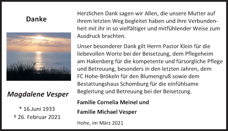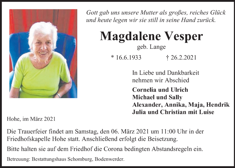 Hier finden Sie alle Traueranzeigen aus der Zeitung, die bisher für Magdalene Vesper erschienen sind. Weitere Traueranzeigen, die in der Zeitung erscheinen, werden hier ebenfalls aufgelistet