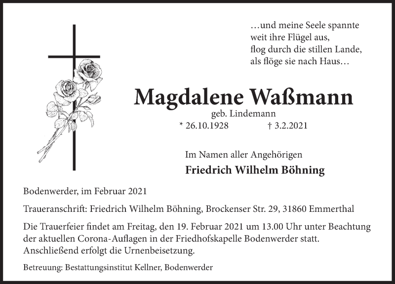 Hier finden Sie alle Traueranzeigen aus der Zeitung, die bisher für Magdalene Waßmann erschienen sind. Weitere Traueranzeigen, die in der Zeitung erscheinen, werden hier ebenfalls aufgelistet
