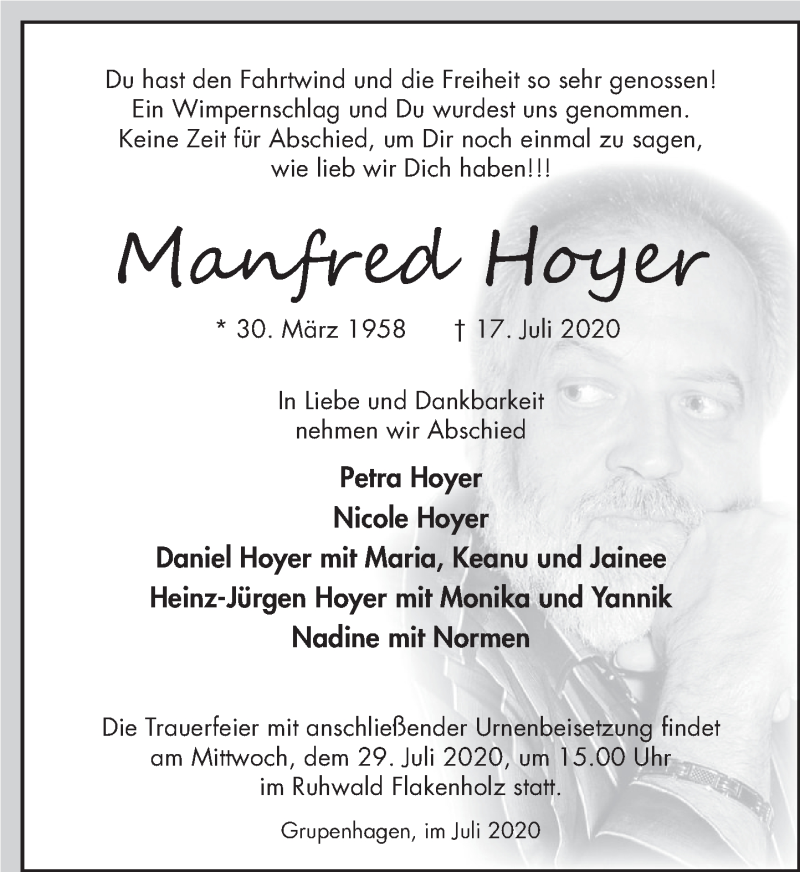 Hier finden Sie alle Traueranzeigen aus der Zeitung, die bisher für Manfred Hoyer erschienen sind. Weitere Traueranzeigen, die in der Zeitung erscheinen, werden hier ebenfalls aufgelistet
