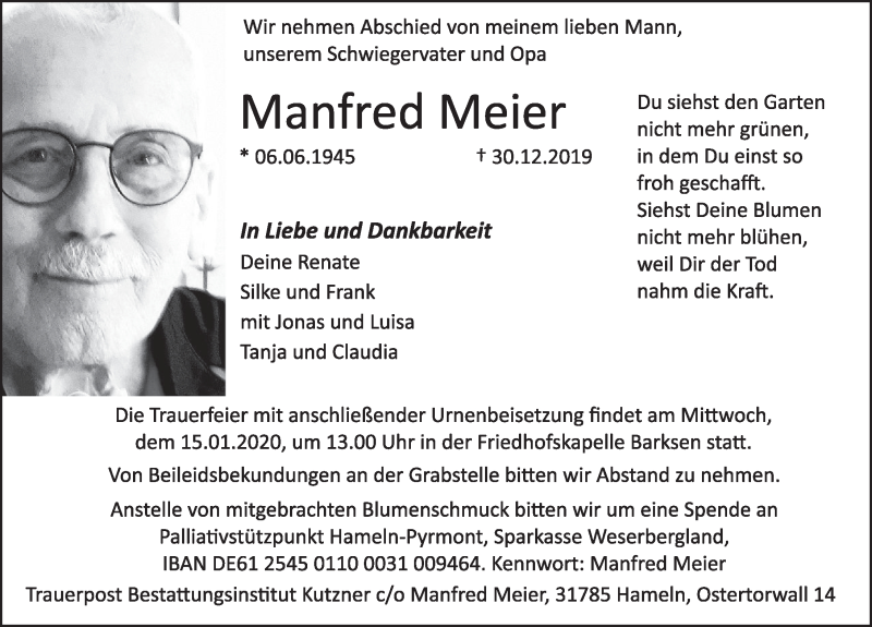 Hier finden Sie alle Traueranzeigen aus der Zeitung, die bisher für Manfred Meier erschienen sind. Weitere Traueranzeigen, die in der Zeitung erscheinen, werden hier ebenfalls aufgelistet