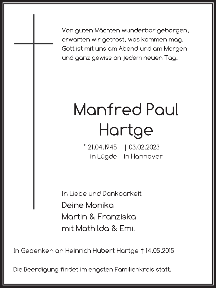 Hier finden Sie alle Traueranzeigen aus der Zeitung, die bisher für Manfred Paul Hartge erschienen sind. Weitere Traueranzeigen, die in der Zeitung erscheinen, werden hier ebenfalls aufgelistet