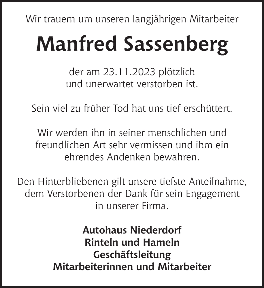 Hier finden Sie alle Traueranzeigen aus der Zeitung, die bisher für Manfred Sassenberg erschienen sind. Weitere Traueranzeigen, die in der Zeitung erscheinen, werden hier ebenfalls aufgelistet