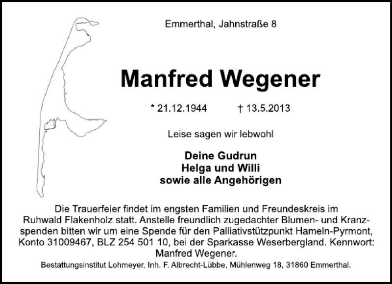 Hier finden Sie alle Traueranzeigen aus der Zeitung, die bisher für Manfred Wegener erschienen sind. Weitere Traueranzeigen, die in der Zeitung erscheinen, werden hier ebenfalls aufgelistet