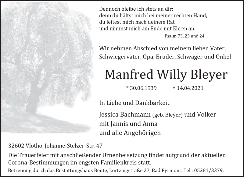 Hier finden Sie alle Traueranzeigen aus der Zeitung, die bisher für Manfred Willy Bleyer erschienen sind. Weitere Traueranzeigen, die in der Zeitung erscheinen, werden hier ebenfalls aufgelistet