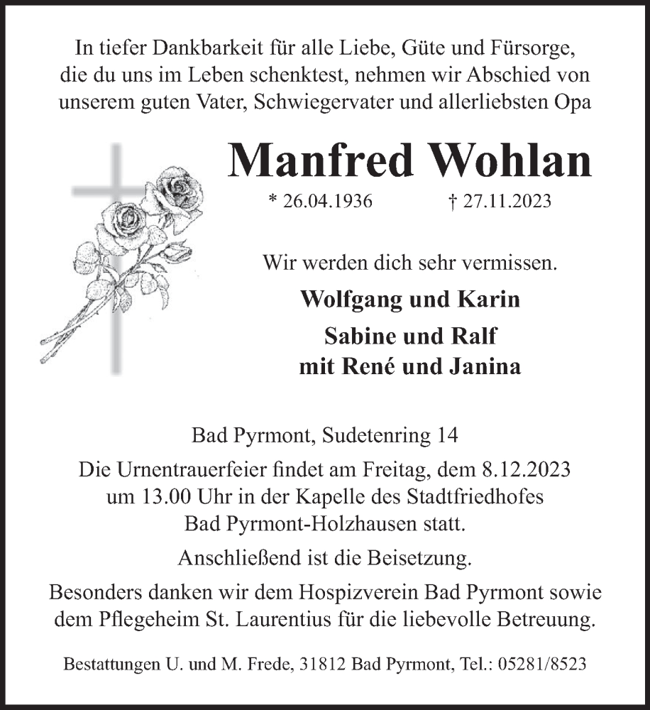 Hier finden Sie alle Traueranzeigen aus der Zeitung, die bisher für Manfred Wohlan erschienen sind. Weitere Traueranzeigen, die in der Zeitung erscheinen, werden hier ebenfalls aufgelistet