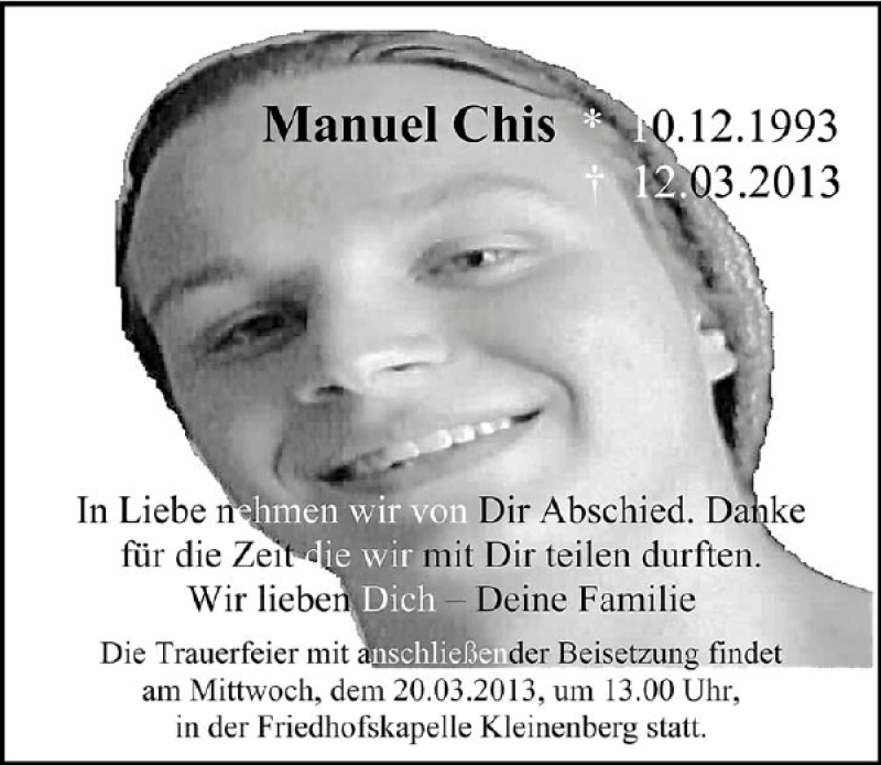 Hier finden Sie alle Traueranzeigen aus der Zeitung, die bisher für Manuel Chis erschienen sind. Weitere Traueranzeigen, die in der Zeitung erscheinen, werden hier ebenfalls aufgelistet