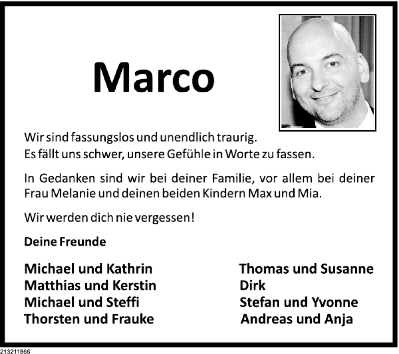 Hier finden Sie alle Traueranzeigen aus der Zeitung, die bisher für Marco erschienen sind. Weitere Traueranzeigen, die in der Zeitung erscheinen, werden hier ebenfalls aufgelistet