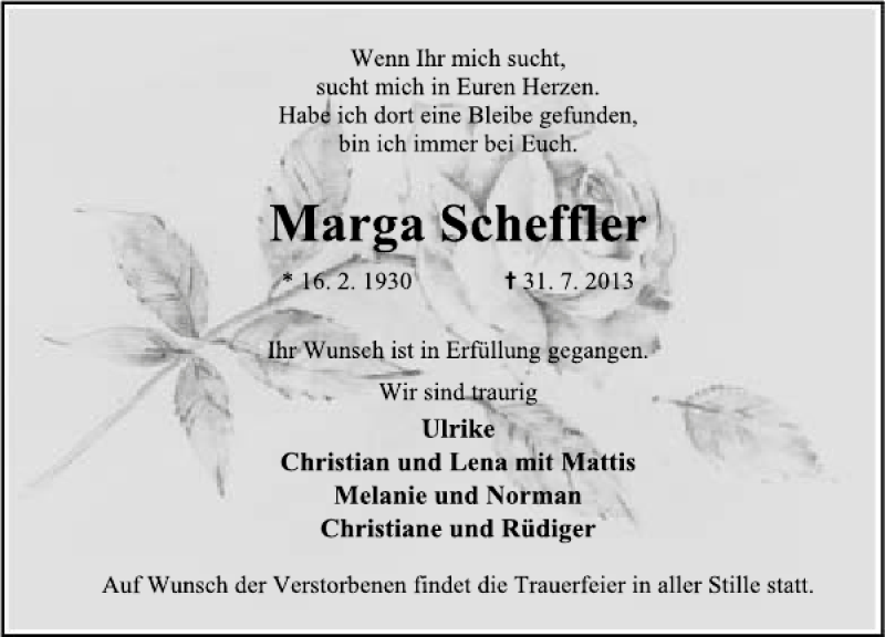 Hier finden Sie alle Traueranzeigen aus der Zeitung, die bisher für Marga Scheffler erschienen sind. Weitere Traueranzeigen, die in der Zeitung erscheinen, werden hier ebenfalls aufgelistet
