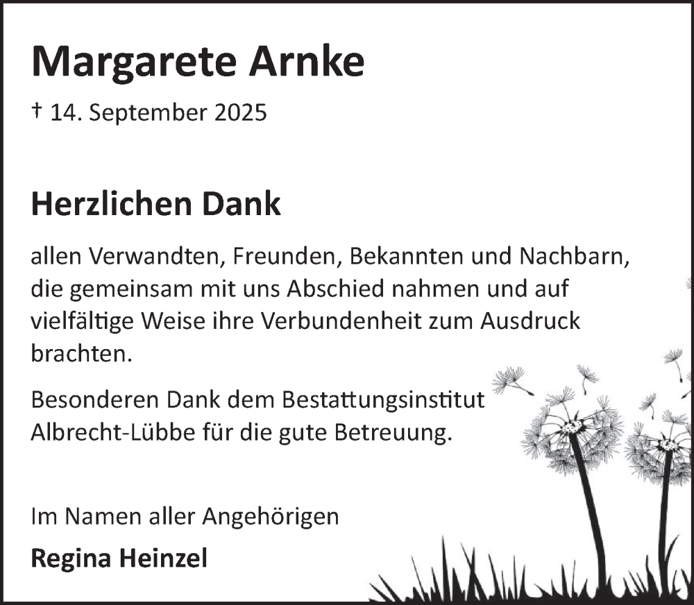 Hier finden Sie alle Traueranzeigen aus der Zeitung, die bisher für Margarete Arnke erschienen sind. Weitere Traueranzeigen, die in der Zeitung erscheinen, werden hier ebenfalls aufgelistet
