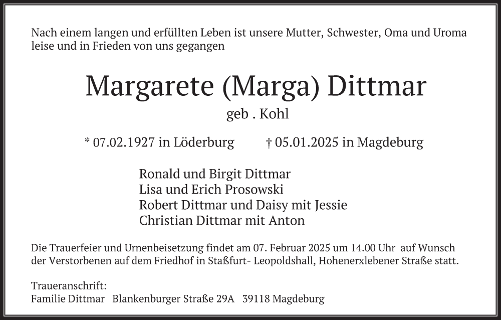 Hier finden Sie alle Traueranzeigen aus der Zeitung, die bisher für Margarete Dittmar erschienen sind. Weitere Traueranzeigen, die in der Zeitung erscheinen, werden hier ebenfalls aufgelistet