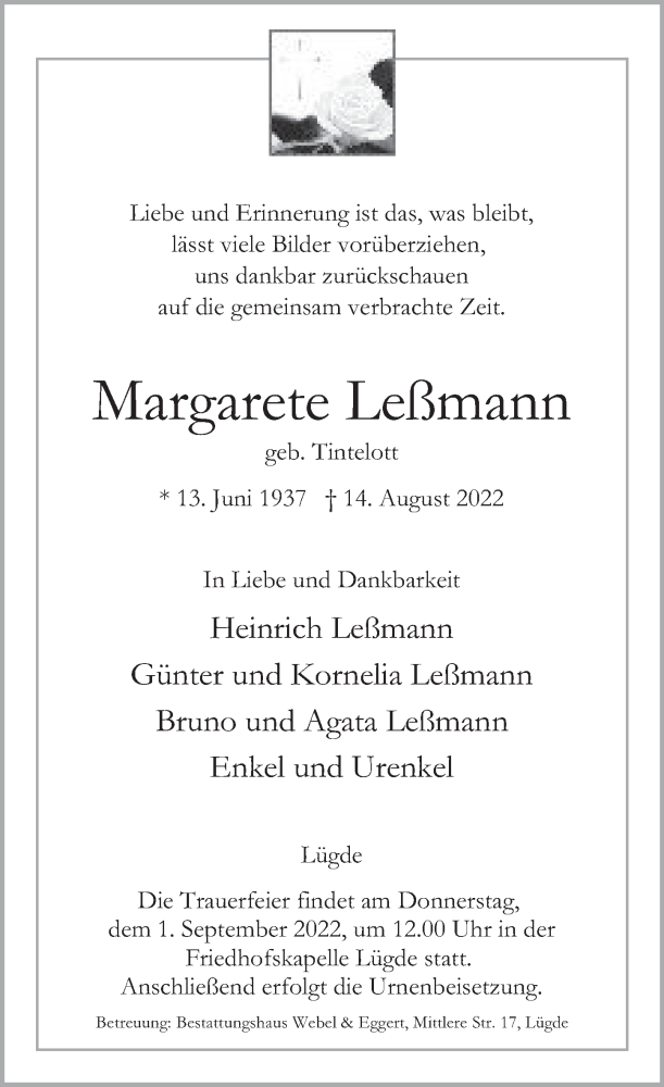 Hier finden Sie alle Traueranzeigen aus der Zeitung, die bisher für Margarete Leßmann erschienen sind. Weitere Traueranzeigen, die in der Zeitung erscheinen, werden hier ebenfalls aufgelistet