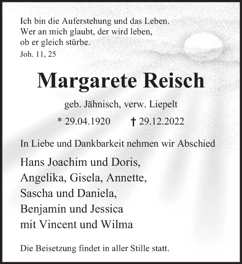 Hier finden Sie alle Traueranzeigen aus der Zeitung, die bisher für Margarete Reisch erschienen sind. Weitere Traueranzeigen, die in der Zeitung erscheinen, werden hier ebenfalls aufgelistet