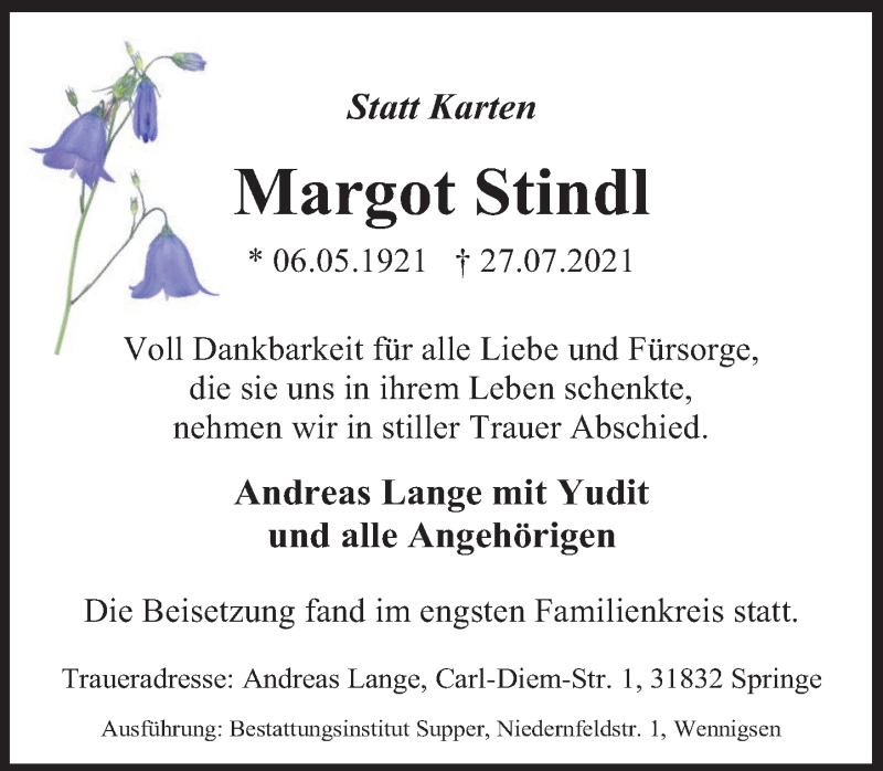Hier finden Sie alle Traueranzeigen aus der Zeitung, die bisher für Margot Stindl erschienen sind. Weitere Traueranzeigen, die in der Zeitung erscheinen, werden hier ebenfalls aufgelistet