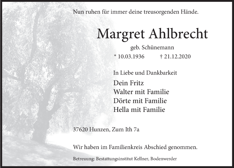 Hier finden Sie alle Traueranzeigen aus der Zeitung, die bisher für Margret Ahlbrecht erschienen sind. Weitere Traueranzeigen, die in der Zeitung erscheinen, werden hier ebenfalls aufgelistet