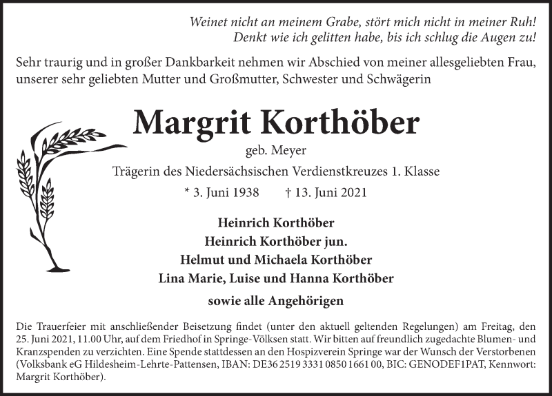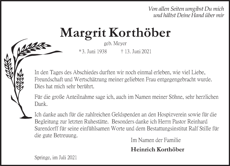 Hier finden Sie alle Traueranzeigen aus der Zeitung, die bisher für Margrit Korthöber erschienen sind. Weitere Traueranzeigen, die in der Zeitung erscheinen, werden hier ebenfalls aufgelistet