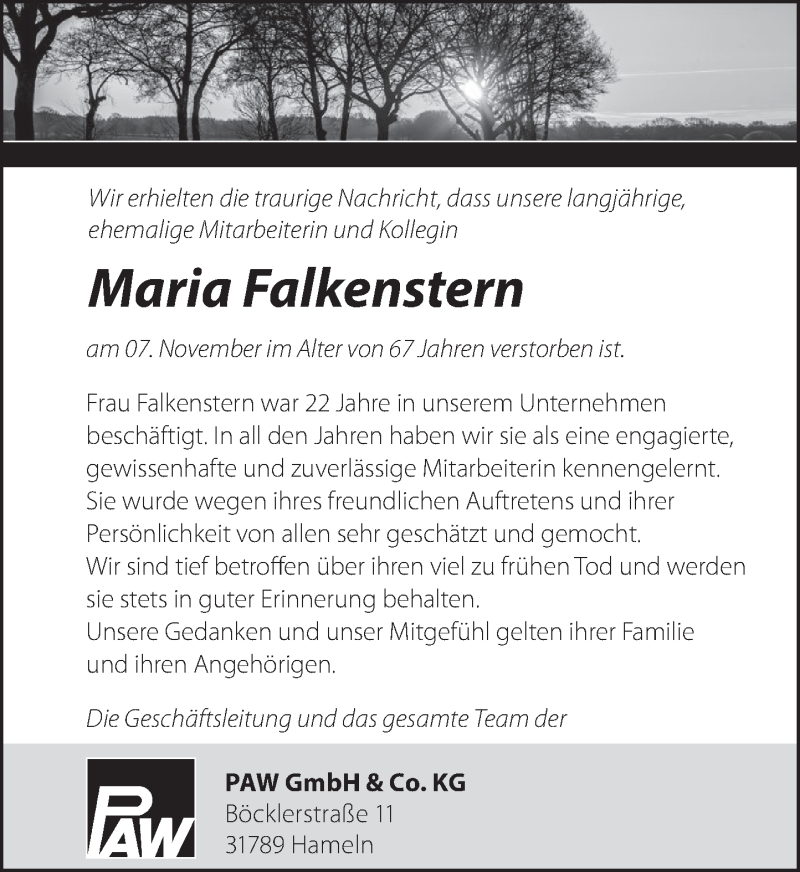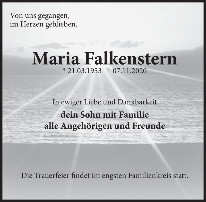Hier finden Sie alle Traueranzeigen aus der Zeitung, die bisher für Maria Falkenstern erschienen sind. Weitere Traueranzeigen, die in der Zeitung erscheinen, werden hier ebenfalls aufgelistet