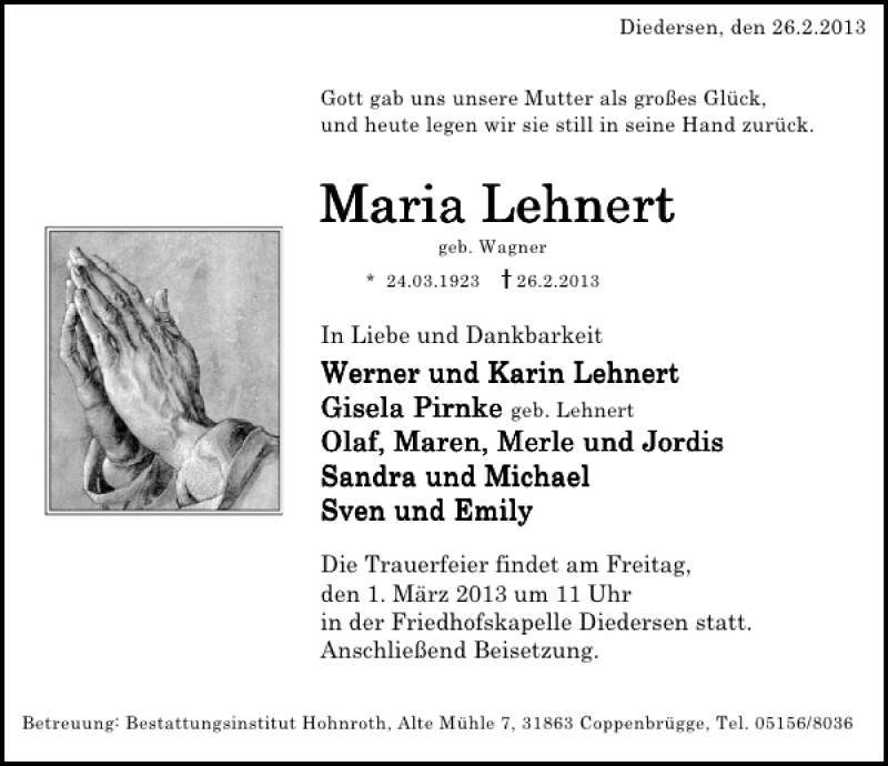 Hier finden Sie alle Traueranzeigen aus der Zeitung, die bisher für Maria Lehnert erschienen sind. Weitere Traueranzeigen, die in der Zeitung erscheinen, werden hier ebenfalls aufgelistet
