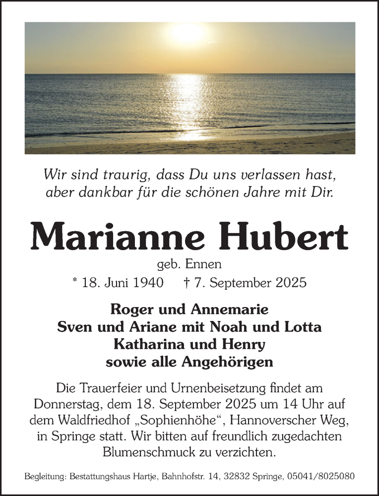 Hier finden Sie alle Traueranzeigen aus der Zeitung, die bisher für Marianne Hubert erschienen sind. Weitere Traueranzeigen, die in der Zeitung erscheinen, werden hier ebenfalls aufgelistet
