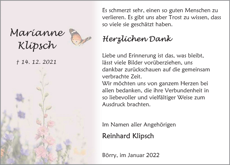 Hier finden Sie alle Traueranzeigen aus der Zeitung, die bisher für Marianne Klipsch erschienen sind. Weitere Traueranzeigen, die in der Zeitung erscheinen, werden hier ebenfalls aufgelistet
