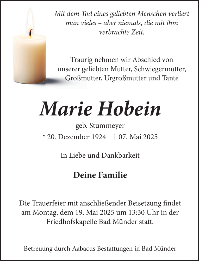 Hier finden Sie alle Traueranzeigen aus der Zeitung, die bisher für Marie Hobein erschienen sind. Weitere Traueranzeigen, die in der Zeitung erscheinen, werden hier ebenfalls aufgelistet