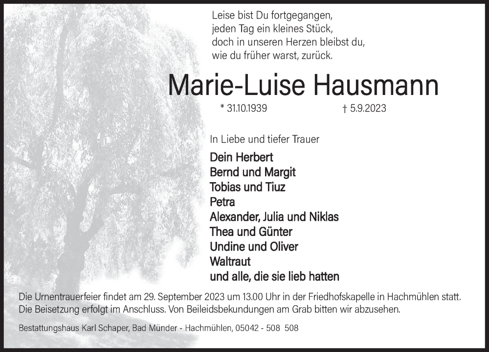 Hier finden Sie alle Traueranzeigen aus der Zeitung, die bisher für Marie-Luise Hausmann erschienen sind. Weitere Traueranzeigen, die in der Zeitung erscheinen, werden hier ebenfalls aufgelistet